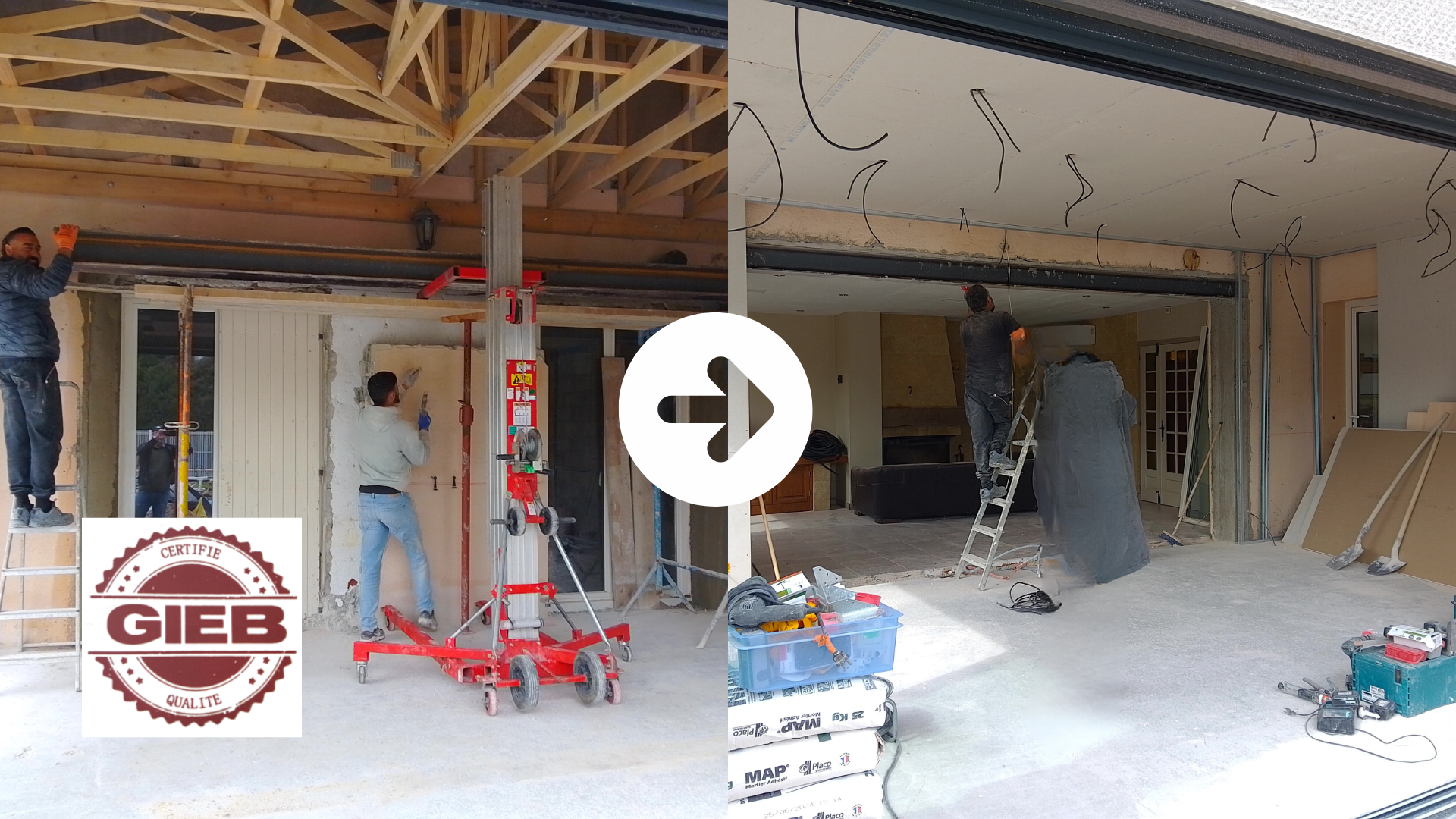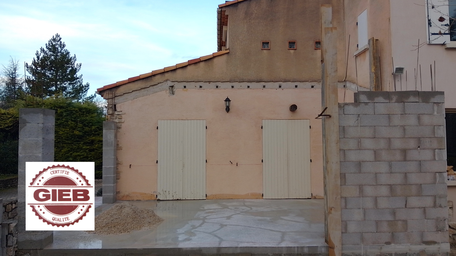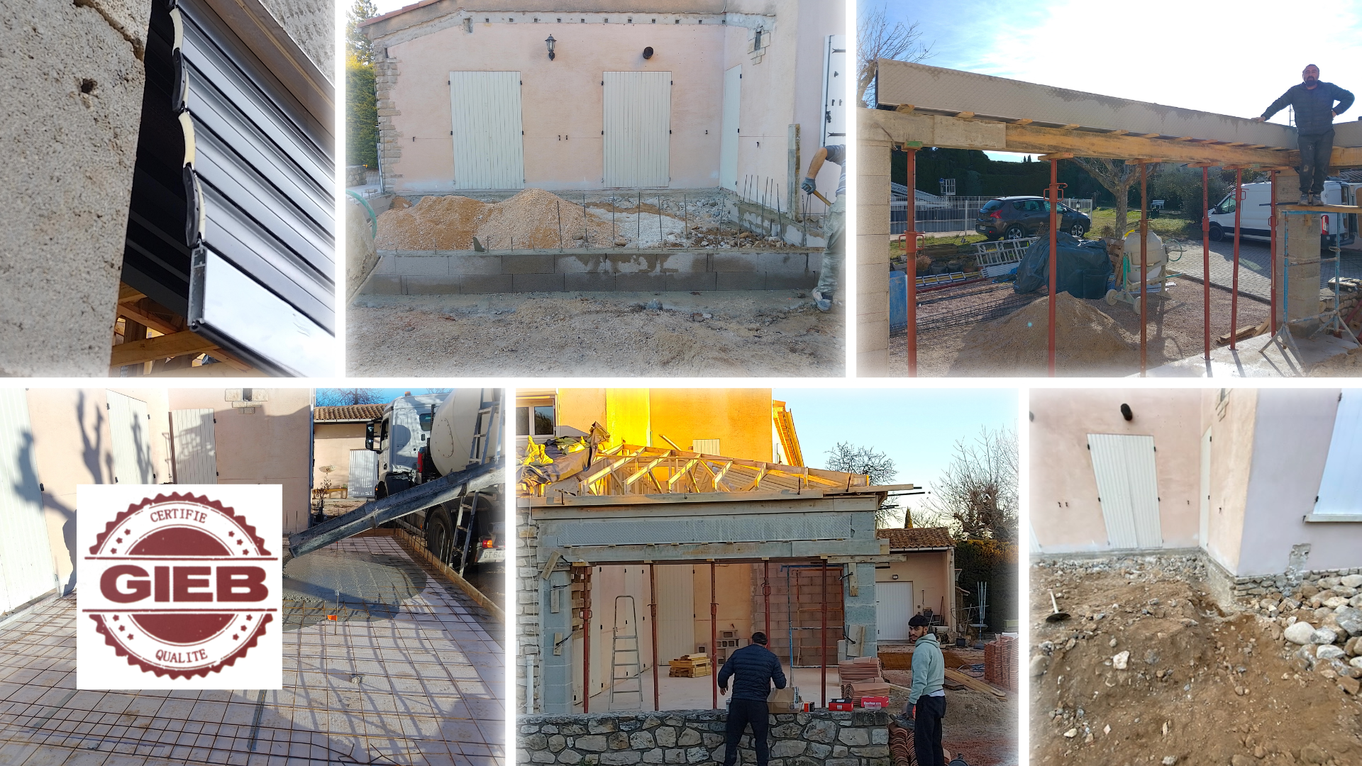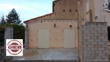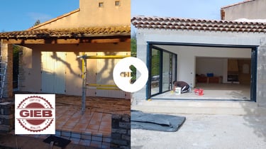 Le G.I.E.B a ensuite pris en charge la totalité des travaux : fondations, élévation de l’extension, création et sécurisation de l’ouverture porteuse, mise en œuvre de la toiture, intégration des réseaux techniques, dont l’électricité, puis réalisation des finitions intérieures et extérieures.